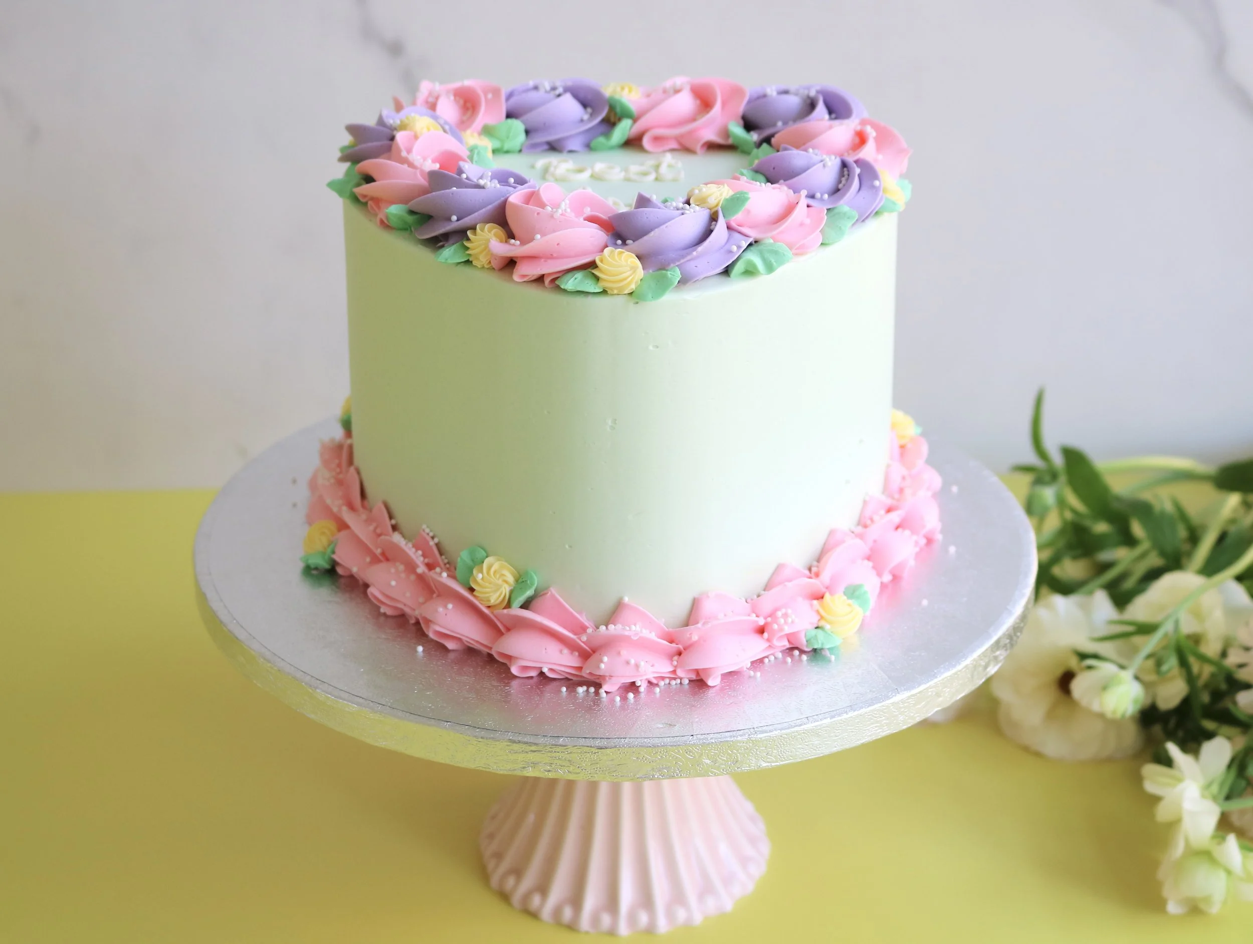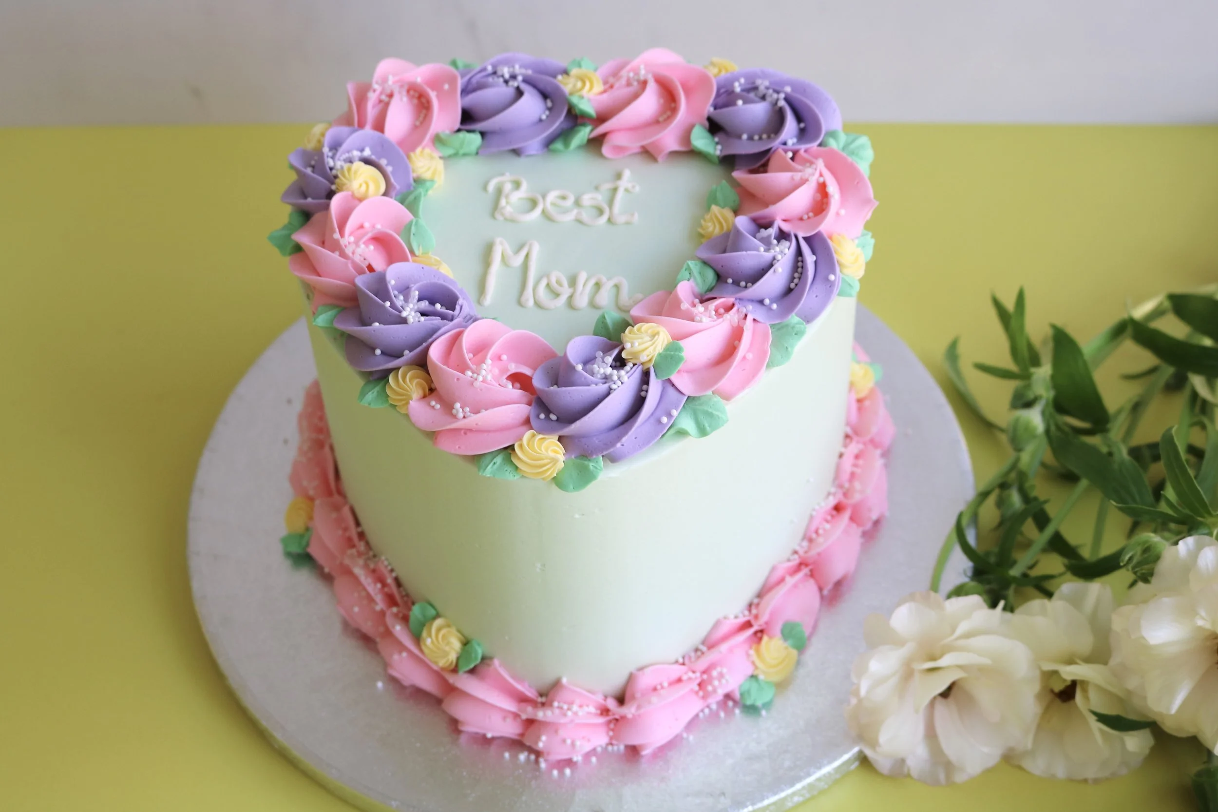 Send love to Mum with this cute heart cake. This heart-shaped beauty is finished with silky smooth buttercream in pastel green, decorated with a crown of hand-piped buttercream roses, and delicate pearl sprinkles. Perfect for gifting, sharing, and making her feel extra loved.