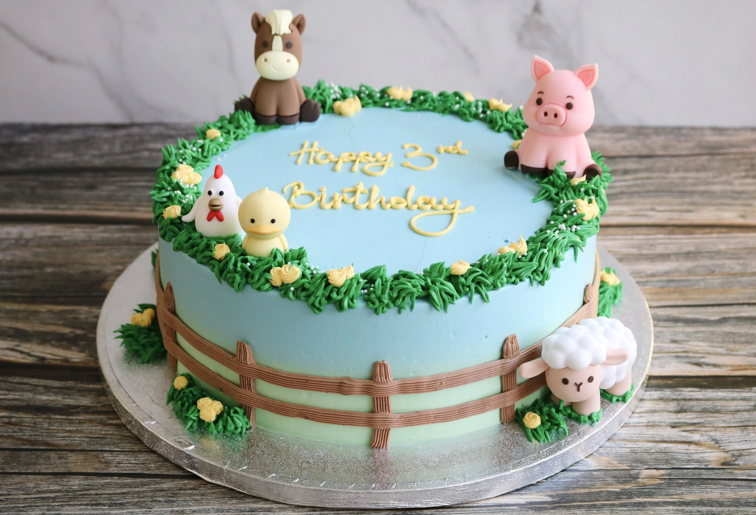 Bring the barnyard to the party with this Farm Animal Birthday Cake - a sweet centrepiece for kids’ celebrations, baby showers, and animal-themed parties. Covered in a soft pastel blue and green buttercream, the cake is framed with delicate hand-piped buttercream grass, tiny flower buds, and a charming fence around the sides.