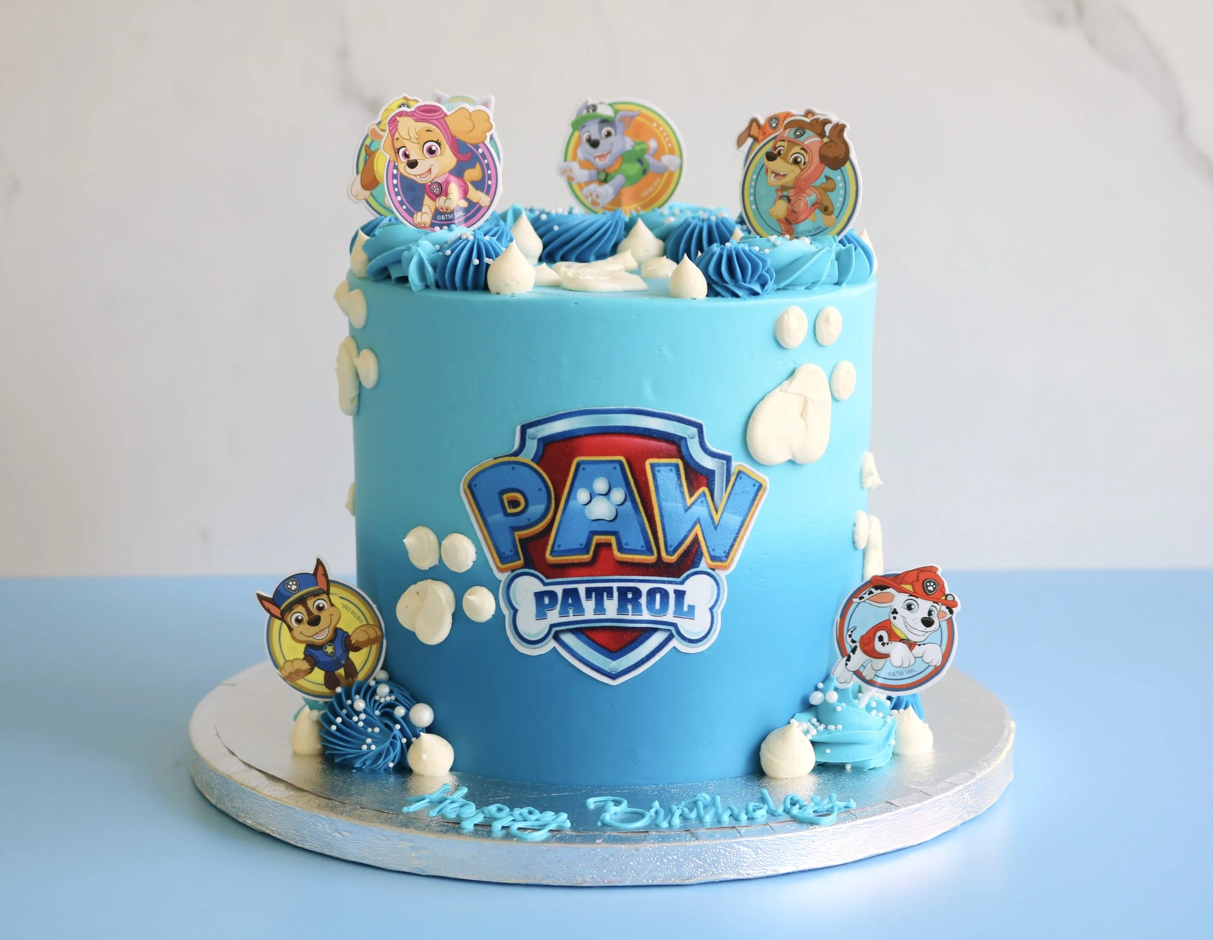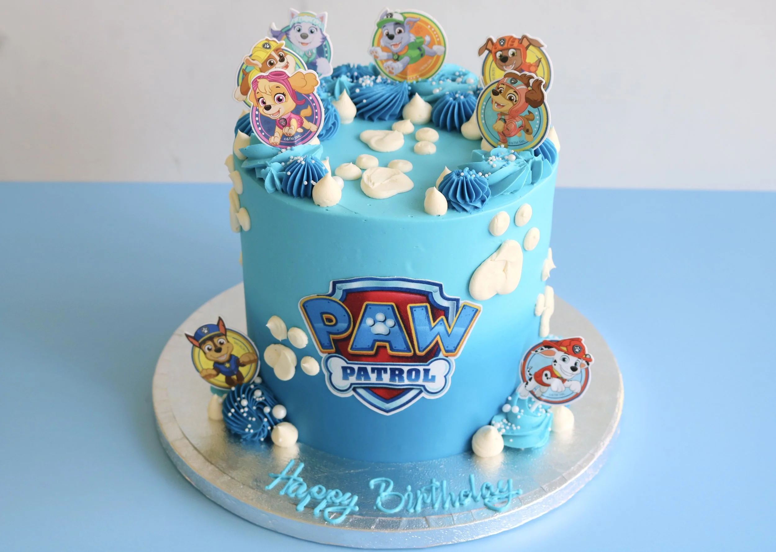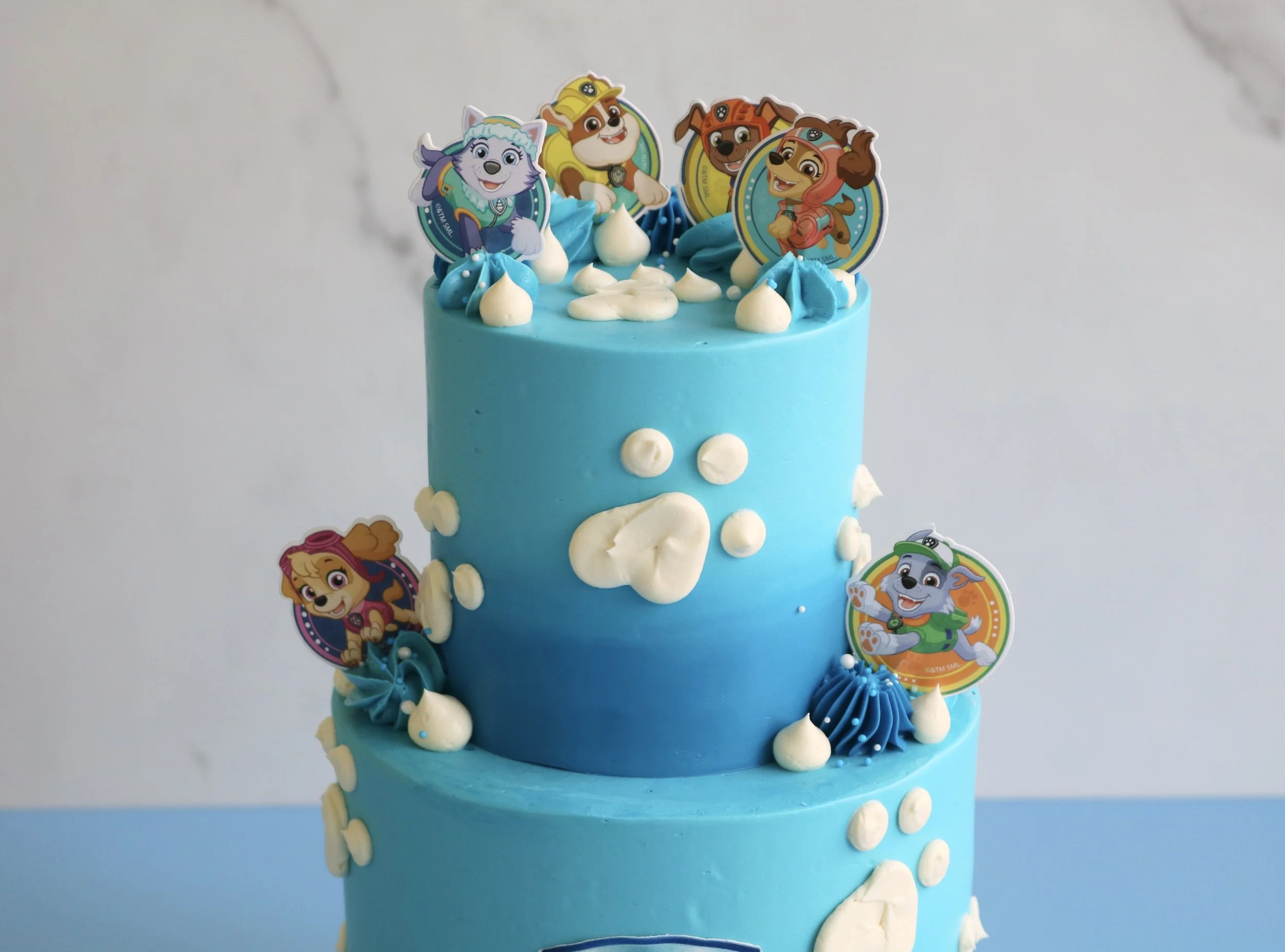 Introducing our much-loved two-tier Paw Patrol cake, available in a blue or pink colour scheme. Each cake is finished with a smooth ombre buttercream in your chosen shade, then decorated with a Paw Patrol edible icing logo, hand-piped buttercream paw prints, swirls, sprinkles and finished with (non-edible) character toppers around the tiers.