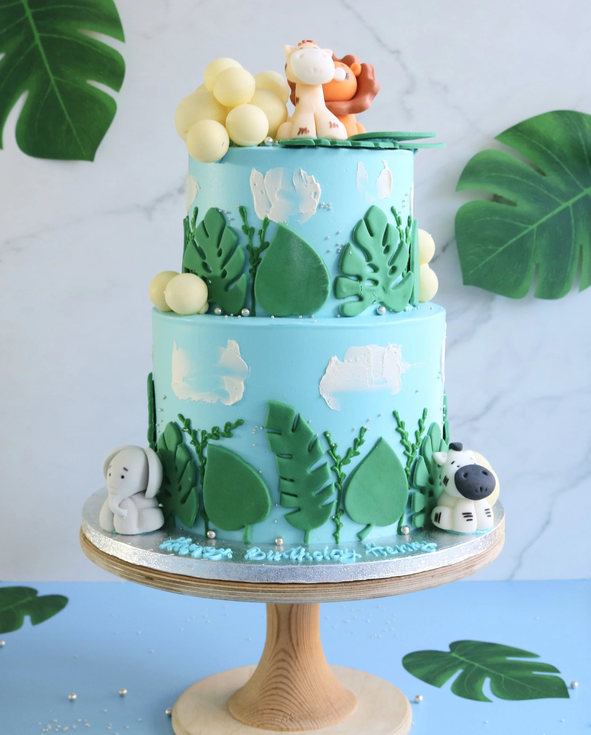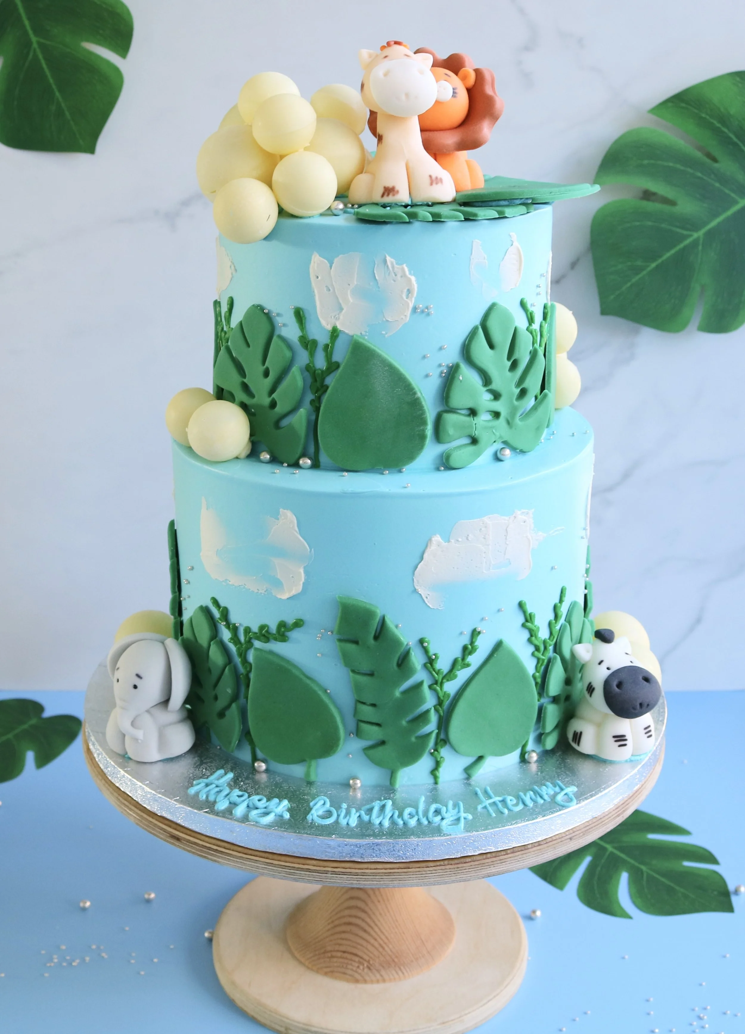 Introducing our adorable Jungle Animal Theme Cake in 2 tiered cake size - a delightful centrepiece that will bring a touch of wild charm to your celebrations. This cake is adorned with the cutest edible animal cake toppers and intricately crafted leaves handmade with modelling paste, topped whimsical handmade white chocolate balloons.