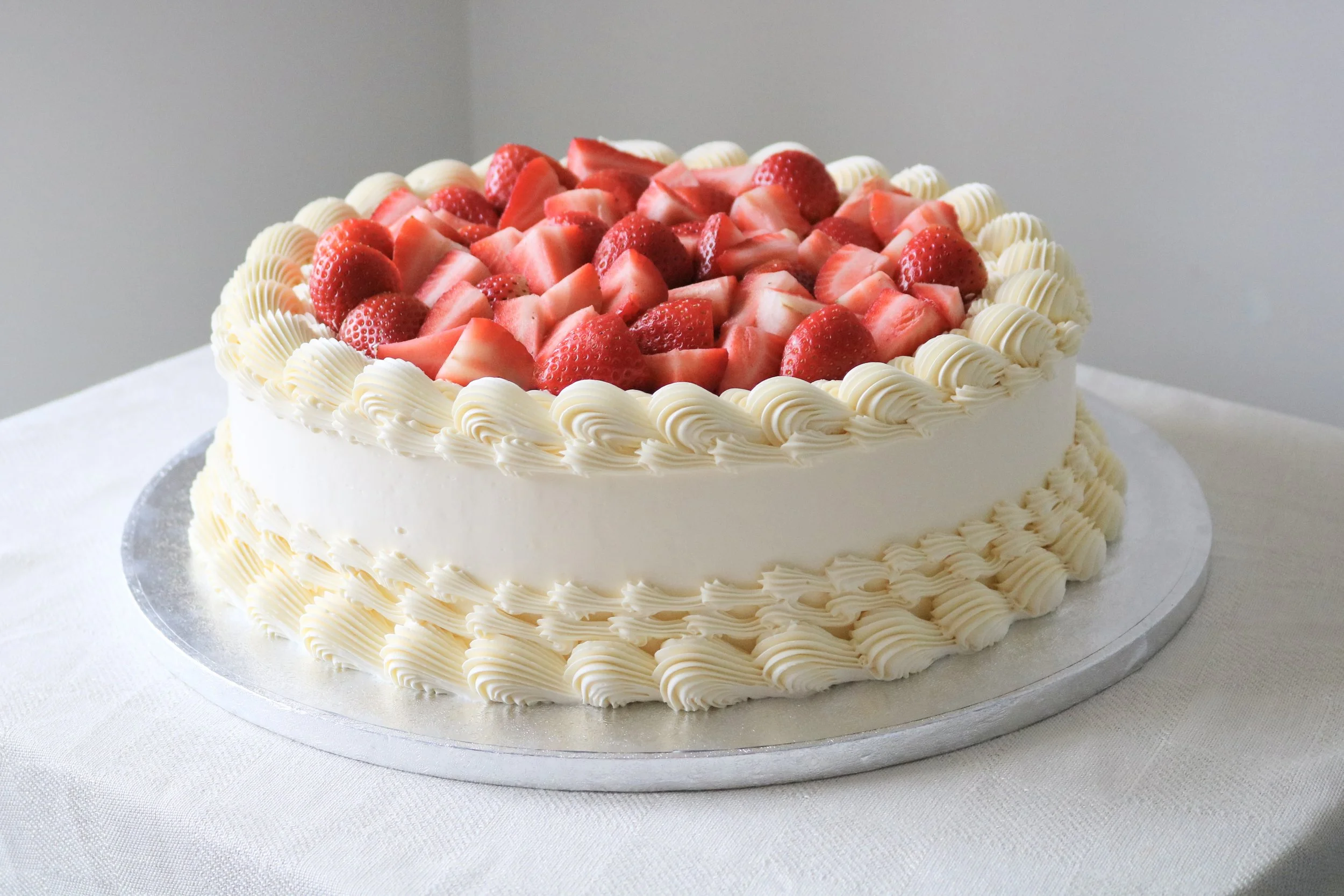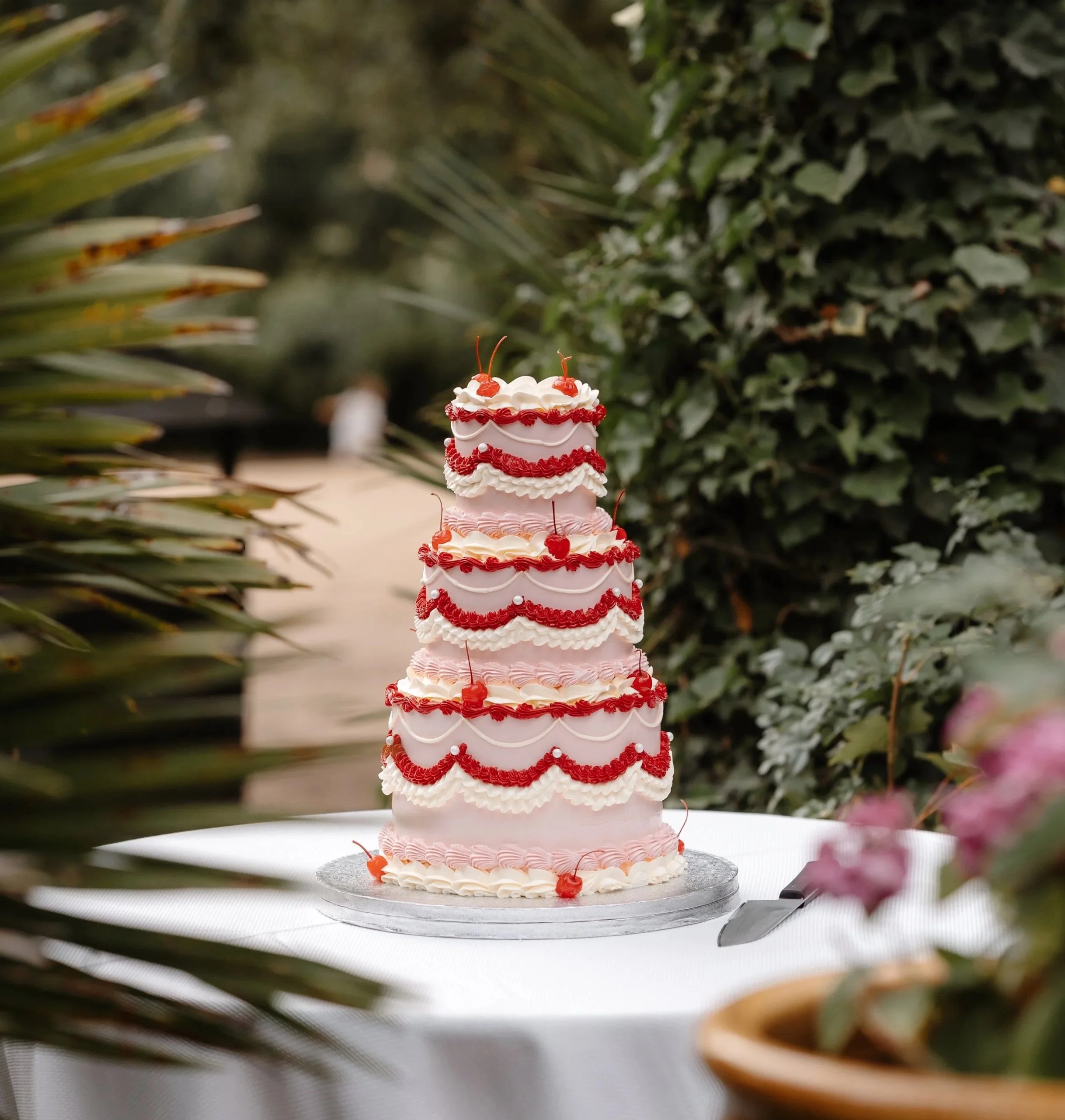 A timeless romantic showpiece, this vintage-inspired wedding cake is crafted in a classic round design with various intricate hand-piped details. Finished in a dreamy cream, pink, and red palette, topped with edible pearls and vibrant maraschino cherries, it’s the perfect blend of elegance and charm. Available in two or three tiered cake size to suit your celebrations.